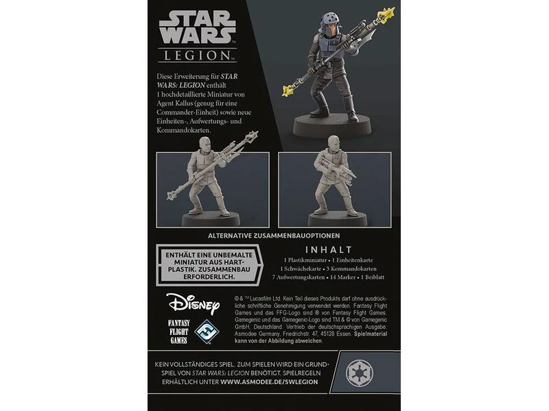 Diese Erweiterung für Star Wars: Legion enthält eine hochdetaillierte Miniatur von Agent Kallus (genug für eine Commander-Einheit) sowie neue Einheiten-, Aufwertungs- und Kommandokarten.