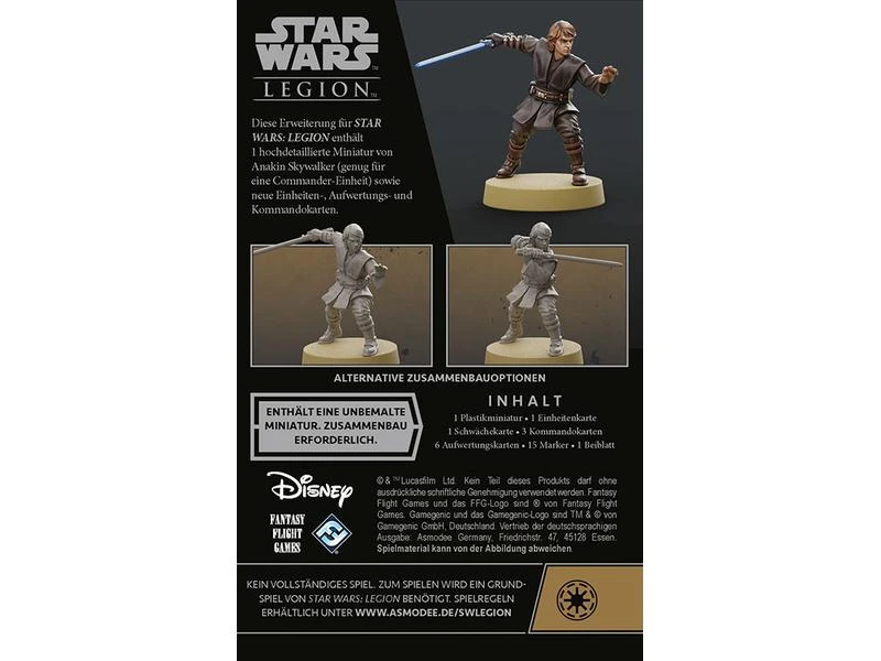 Anakin Skywalker ist einer der Helden der Klonkriege. Ob er Truppen in die Schlacht führt oder den Feind persönlich angreift, er wird alles tun, um die Republik zu schützen, auch wenn dies zu Versuchungen der dunklen Seite führt. Diese Erweiterung enthält eine Anakin-Skywalker-Miniatur, elf Karten und 15 Marker.