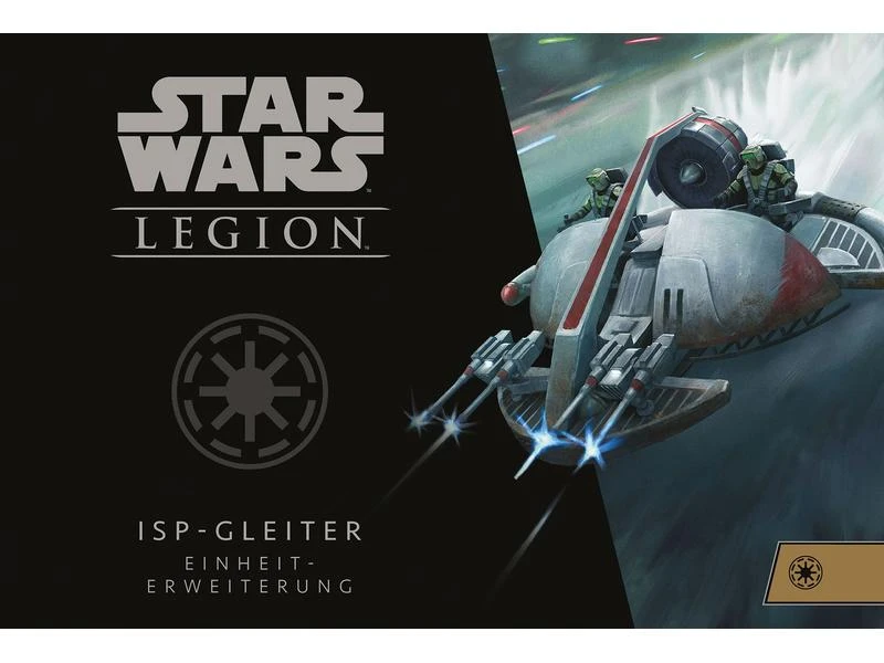 Starke Repulsoren und eine riesige Turbine am Heck machen den ISP-Gleiter zum idealen Geländefahrzeug. Mit einer Bewaffnung, die deutlich über seiner Gewichtsklasse liegt, können die beiden Piloten entweder unterschiedliche Ziele anvisieren oder das Feuer auf ein grosses Ziel fokussieren. . Diese Erweiterung für Star Wars: Legion enthält eine hochdetaillierte Miniatur eines ISP-Gleiters (genug für eine schwere Einheit) sowie neue Einheiten- und Aufwertungskarten.