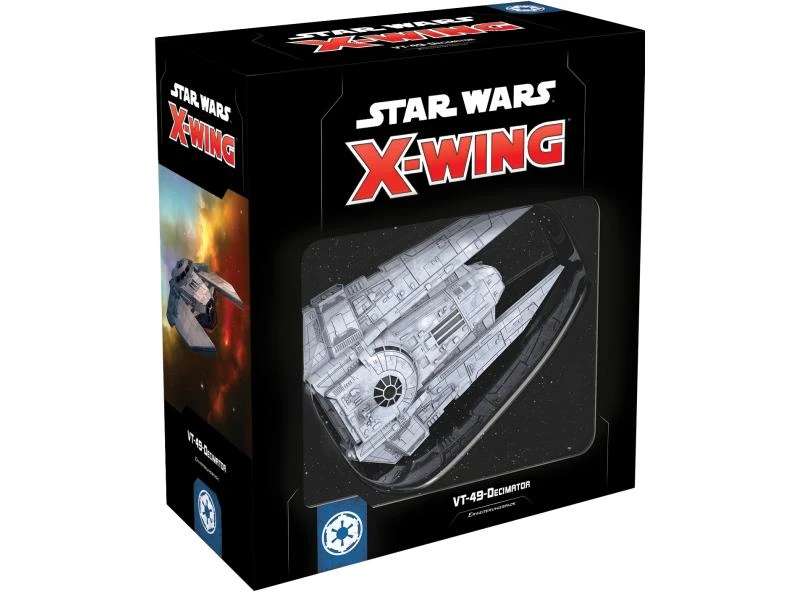 Mit dem VT-49-Decimator Erweiterungspack fügen Sie einen einzelnen VT-49-Decimator zu Ihren Galaktischen Imperium-Staffeln hinzu. Zusätzlich enthalten sind drei Schiffskarten, analog zu den VT-49-Decimator-Schiffskarten aus dem Galaktisches Imperium Konvertierungsset sowie eine Auswahl von dreizehn nachgedruckten Aufwertungskarten, mit denen Sie Ihren Schiffen lebenswichtige Crew und tödliche Technik hinzufügen können. Mit zwei Schnellbau-Karten können Sie Ihren Decimator mit vordefinierten Kombinationen von Schiffs- und Aufwertungskarten sofort in den Kampf bringen.