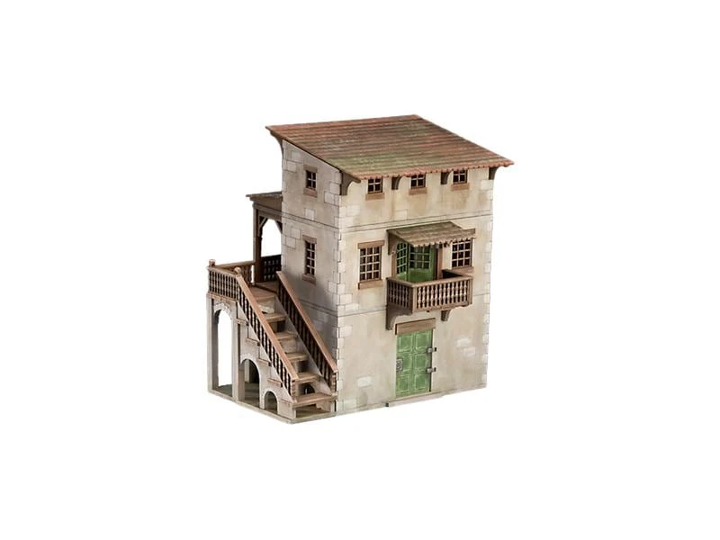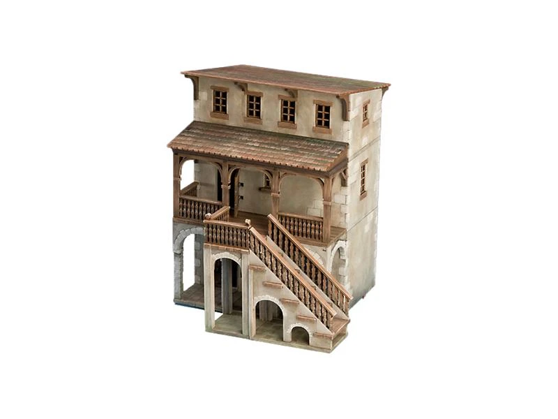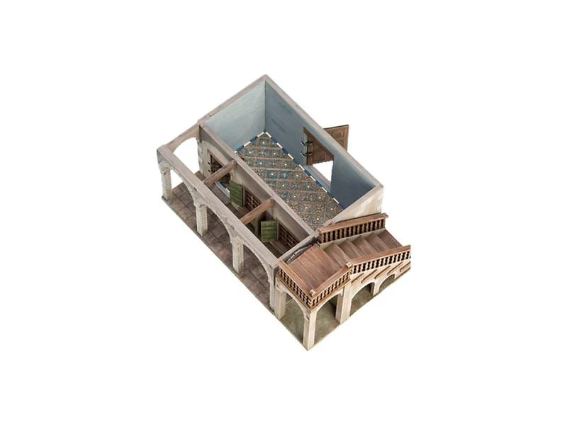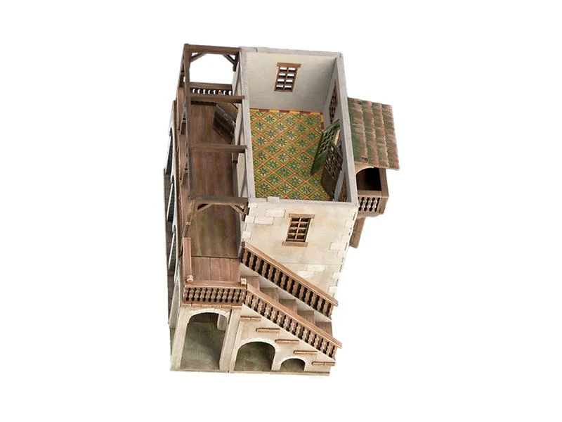 Mit Arkadengängen im Erdgeschoss und im ersten Stock, einer variabel positionierbaren Treppe auf der Miniaturen stehen können, drei abnehmbare Stockwerke, die beliebig aufgesteckt werden können, Fensterläden und einem gefliessten Fussboden in zwei Stockwerken. Der ganze Stolz des vormaligen Besitzers. Hoffentlich gehen die Piraten pfleglich damit um!