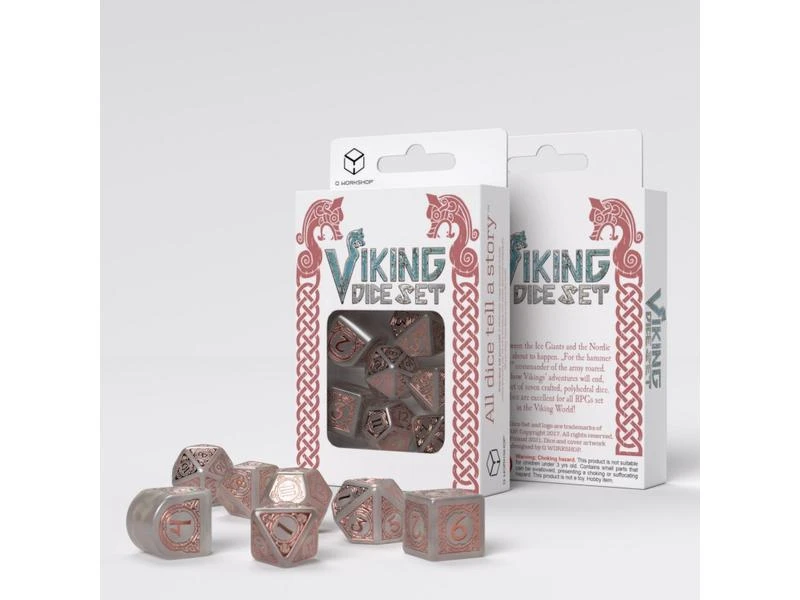 Das Set besteht aus 7 polyedrischen Würfeln mit einem abgerundeten modernen W4. Das Farbthema für dieses Set ist ein nebliger Hintergrund mit Kupferstichen. Die Gravuren auf den Würfeln zeigen Ziffern, die in alter Runenschriftart gehalten sind. Die Würfelflächen sind mit Mustern, Geweben und Symbolen verziert, die vom Ornamentstil der Wikinger inspiriert sind.