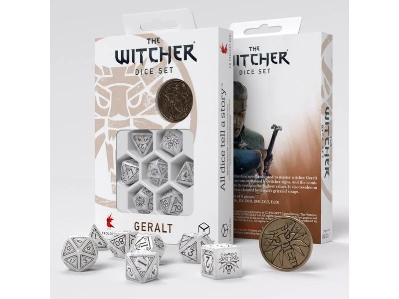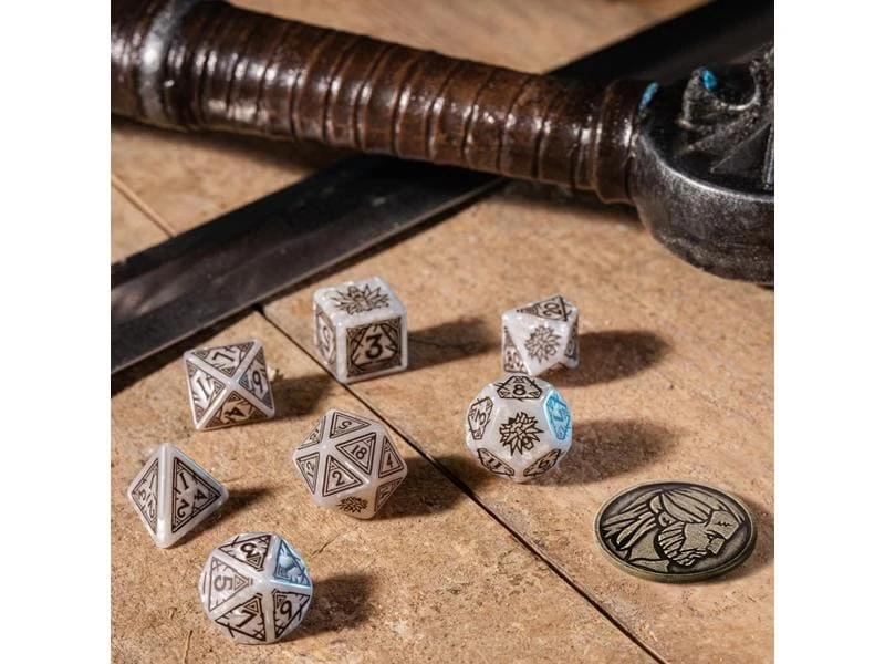 Inspiriert von dem The Witcher-Franchise, ist dieses Würfelset Geralt von Rivia gewidmet – auch bekannt als Gwynbleidd, der Weisse Wolf.