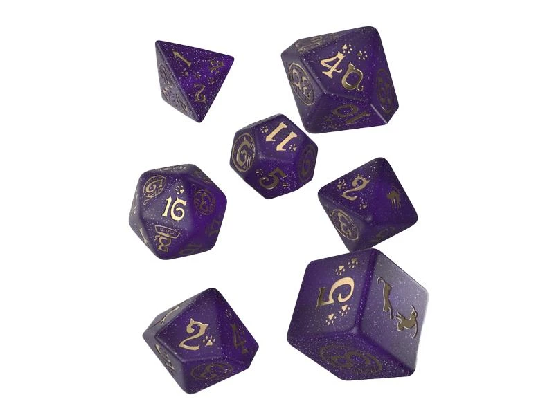 Das Cat’s Dice Set ist nicht nur deshalb bemerkenswert, weil es unseren pelzigen Herrschern… ähm, Kameraden gewidmet wurde. Zunächst einmal ist jeder Würfel anders – auf den höchsten Seiten sind Katzen zu sehen, die sich nach Herzenslust austoben. Ausserdem zeigen einige Gesichter eines ihrer Lieblingsdinge: eine Schüssel mit Futter oder ein Garnknäuel! Wenn Sie genau hinsehen, weren Sie auch Spuren von Katzenfüssen sehen – denn wer würde ihnen verbieten, auf etwas frisch Gemaltes zu treten?