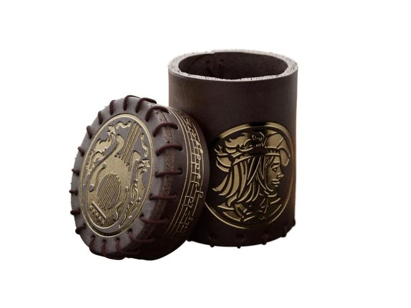 Inspiriert vom The Witcher-Universum, ist dieser Würfelbecher dem Barden Dandelion gewidmet, der auf einem edlen Ross namens Pegasus reiste. Aus echtem, braun gefärbtem Leder gefertigt, passt der Becher perfekt zu seiner mythischen Qualität! Musiknoten fliessen entlang des Deckelumfangs, eine treue Laute ziert den Deckel und auf der Seite ist Dandelions hübsches Gesicht zu sehen – alles in königlichem Gold geprägt!