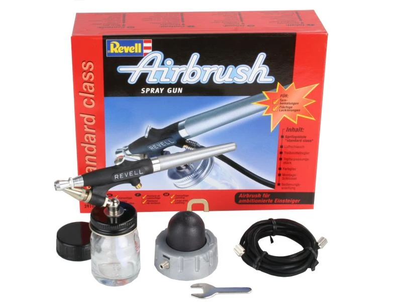 Die Revell Spritzpistole Standard Class eignet sich ideal für Tarnbemalungen und flächige Lackierungen von Modellen. Sie richtet sich an ambitionierte Einsteiger mit wenig Airbrush-Erfahrung. Dank des im Lieferumfang befindlichen Treibmittelreglers können Sie sie sowohl mit einem kompatiblen Kompressor, als auch mit einer Druckluftdose verwenden.