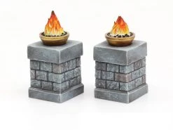 Das Set beinhaltet zwei Feuerschalen und zwei massive Säulen aus Resin. Diese sind steckbar und haben eine Gesamthöhe von ca. 56 mm. Die Abmessungen der Säulen sind ca. 26 x 26 x 35 mm.