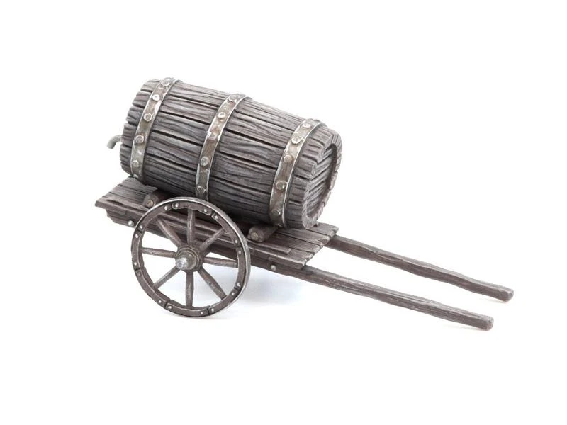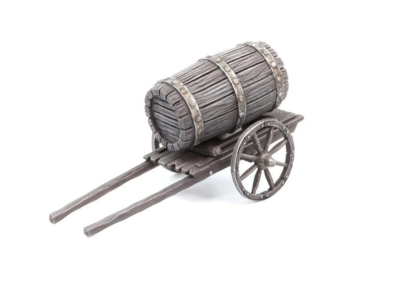 Das Set beinhaltet einen kleinen Wagen im Massstab 28-30 mm. Der Bausatz ist aus Weissmetall gefertigt und muss zusammengebaut werden. Das Fass ist aus Resin gefertigt.