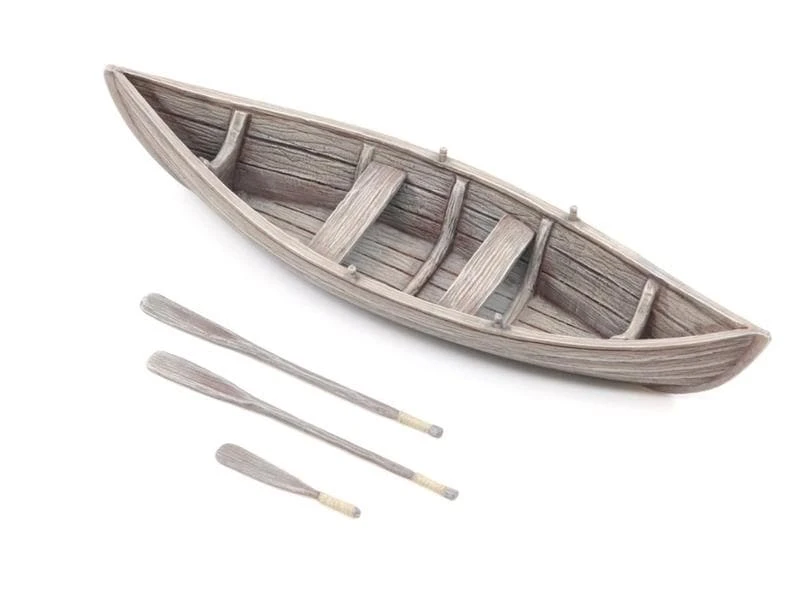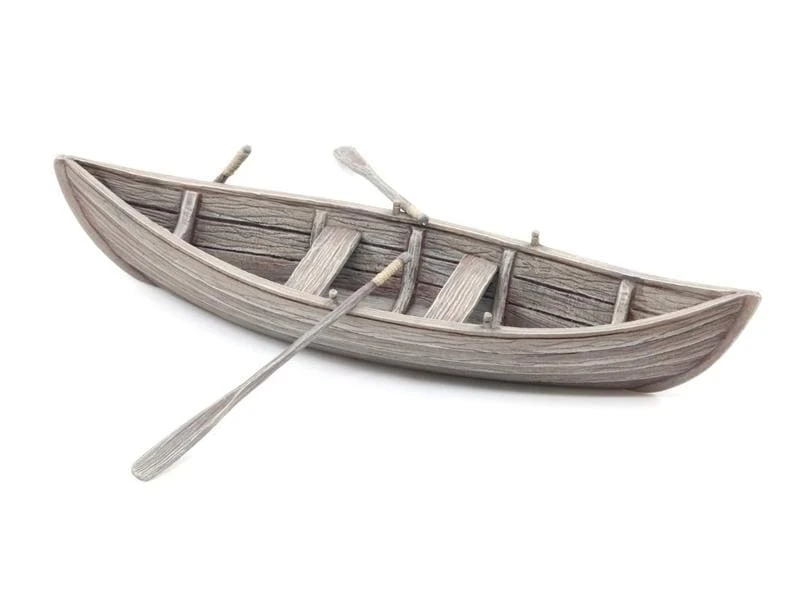 Dieses Ruderboot im Massstab 28-30 mm passt bestens in die Wikingerzeit und in das frühe Mittelalter. Die Sitzbretter sind lose und können alternativ auch entfernt werden, um Platz für Miniaturen oder Gepäck zu schaffen. Neben dem Boot aus Resin sind zwei Ruder, ein Steuerruder und zwei Sitzbretter aus Weissmetall enthalten. Das Seitenruder kann alternativ angebracht werden.