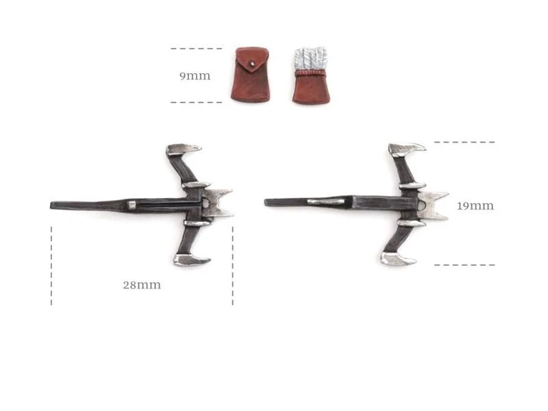 Des Set enthält 5Armbrüste und 5 Armbrustbolzen-Taschen gefertigt aus Weissmetall. Das Set ist geignet für Miniaturen im Massstab 28-30 mm.