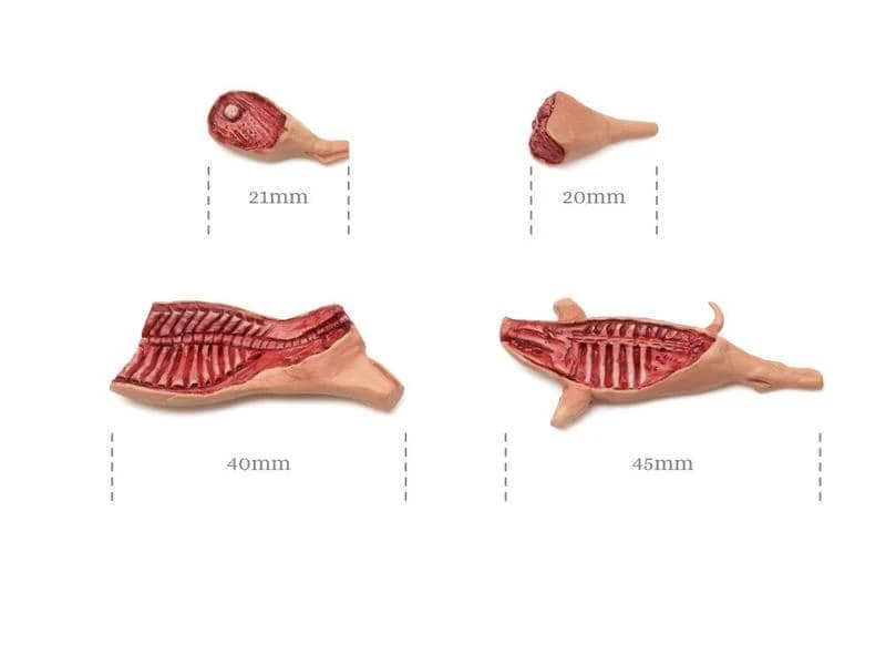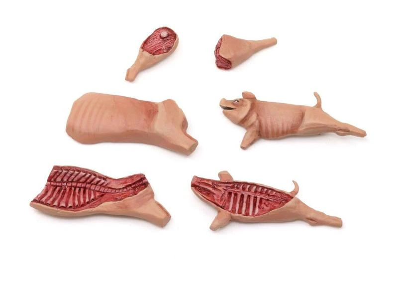 Das Schlachterei-Set beinhaltet zwei Rinderhälften, zwei Schweinehälften und zwei Schlegel. Das Set ist aus Resin gefertigt.