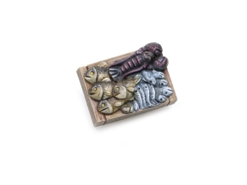 Das Set beinhaltet 5 Kisten mit verschiedenen Fischen und ein Schneidbrett.