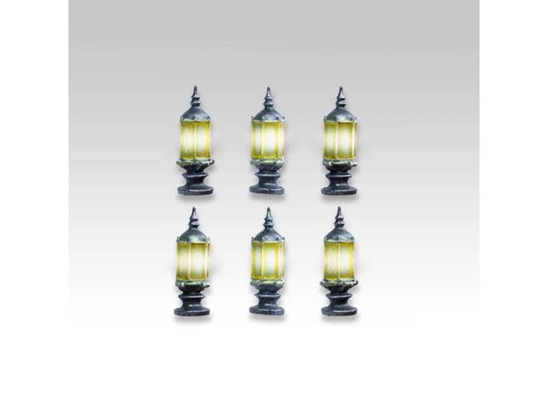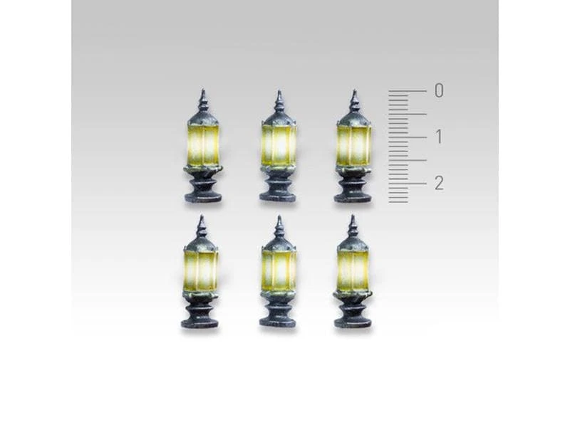 Das Set beinhaltet 6 kleine Laternen zum Befestigen auf einer Mauer, auf Säulen oder neben Hauseingängen. Massstab: 28-30 mm.