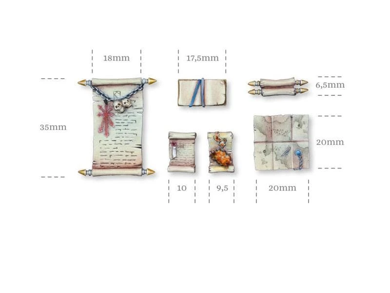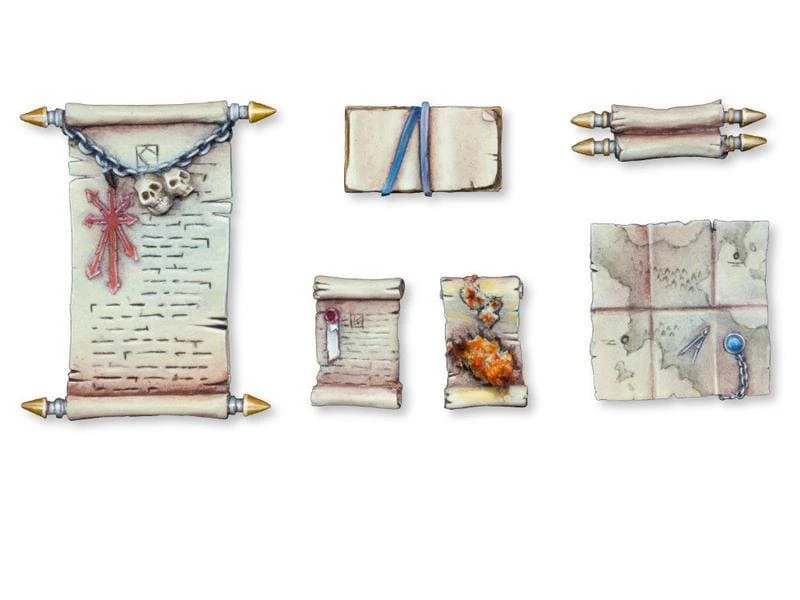 Das Set beinhaltet 6 unterschiedliche Karten und Schriftrollen. Massstab: 28-30 mm.