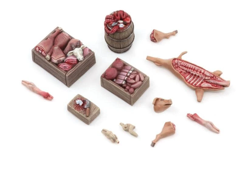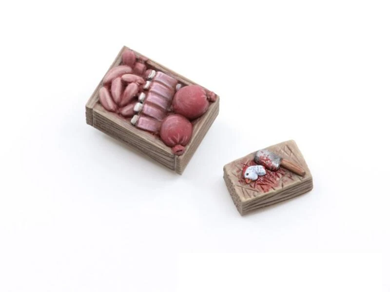 Das Set beinhaltet 2 Kisten mit verschiedenen Würsten und Fleisch. Massstab: 28-30 mm