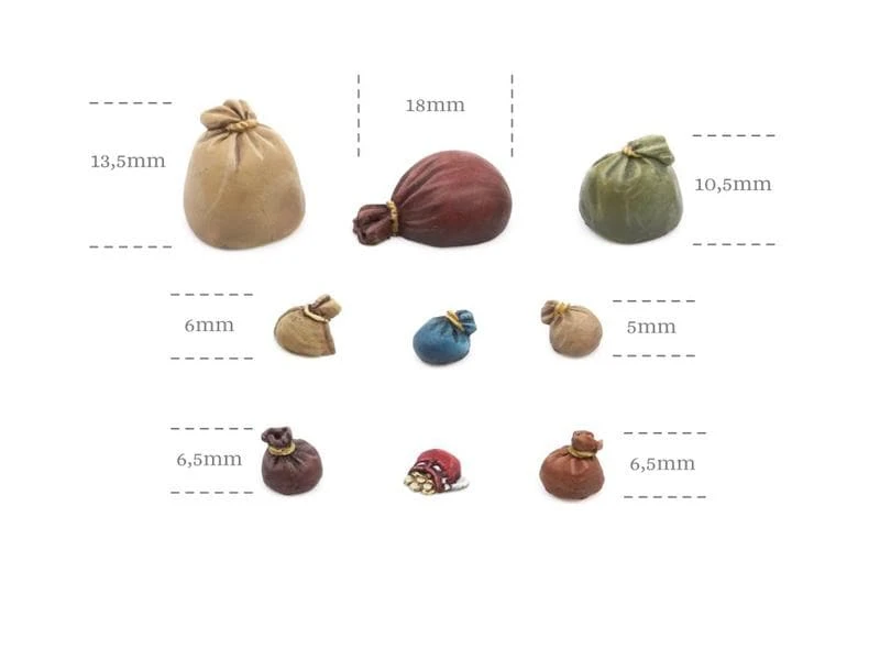 Das Set beinhaltet 9 unterschiedliche kleine Säcke und Beutel aus Resin. Massstab: 28-30 mm.
