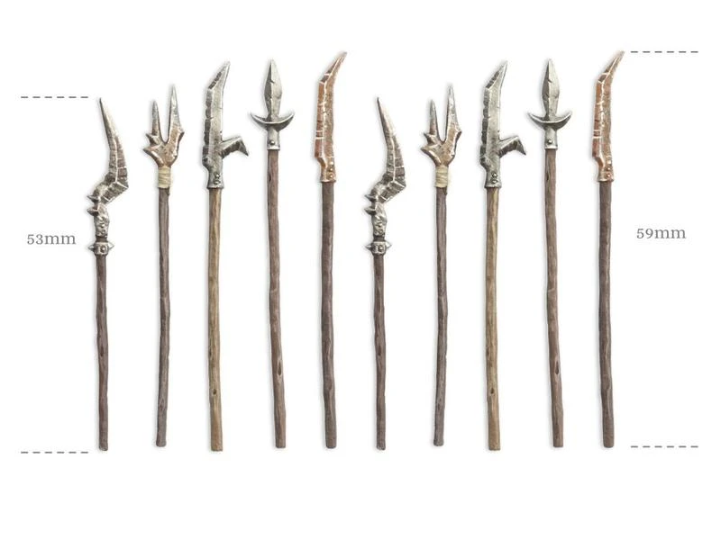 Das Set beinhaltet 10 Speere im Massstab 28-30 mm. Die grob gearbeiteten Speere passen bestens zu bösen Armeen wie z.B. Orks oder Barbaren. Sie haben eine Länge von 53-59 mm und können ganz einfach auf die passende Länge gekürzt werden. Die Speere sind aus Weissmetall gefertigt.