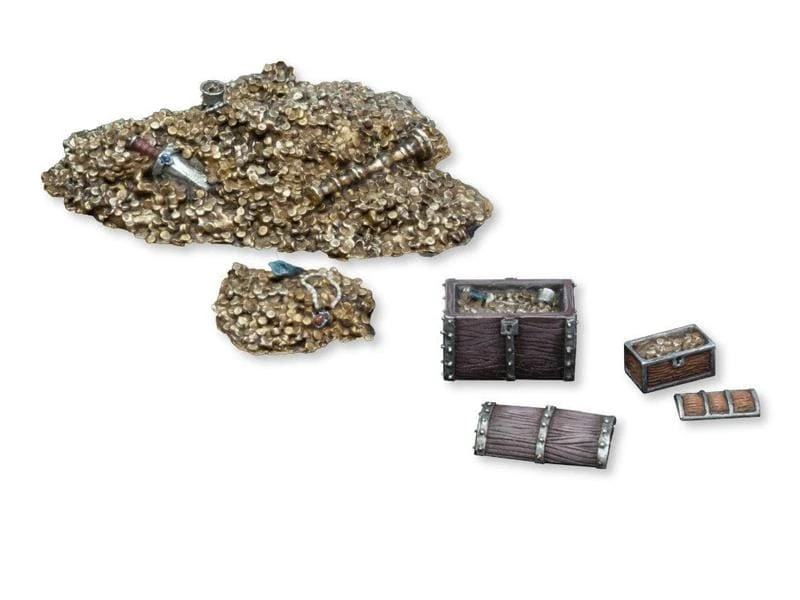 Das Schatz-Set enthält zwei Schatztruhen mit Deckel und zwei Schatzhaufen, gefertigt aus Resin. Ideal zum Gestalten und Verzieren von Tabletop Gelände oder Bases. Massstab: 28-30 mm.