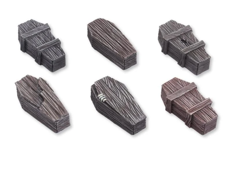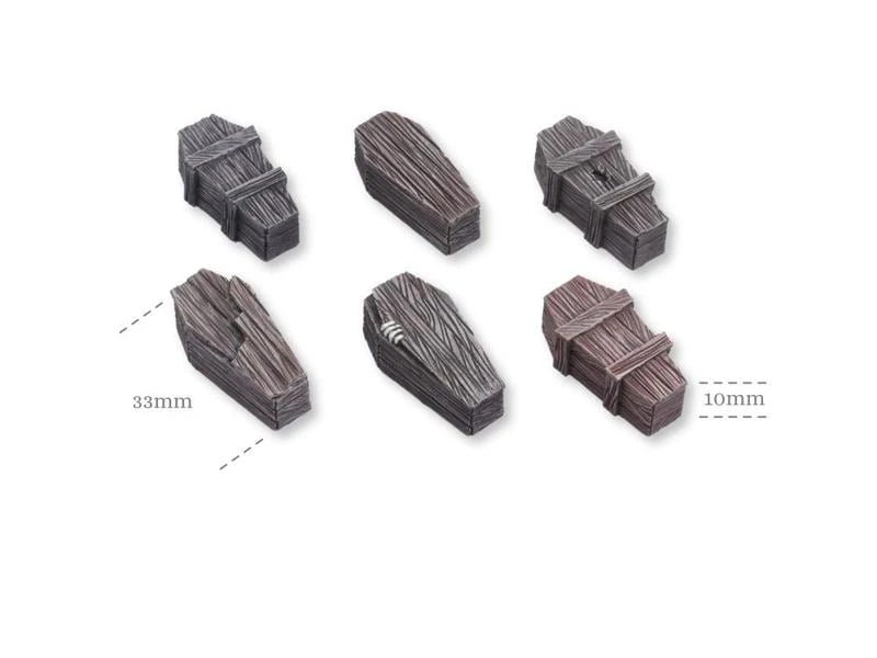 Das Set beinhaltet 6 unterschiedliche Holzsärge im Massstab 28 mm.