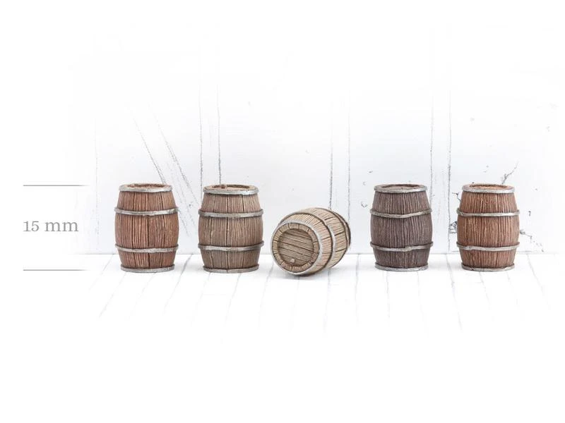 Das Set beinhaltet 5 Holzfässer gefertigt aus Resin. Die Fässer haben eine Höhe von ca. 20 mm. Massstab: 28-30 mm.