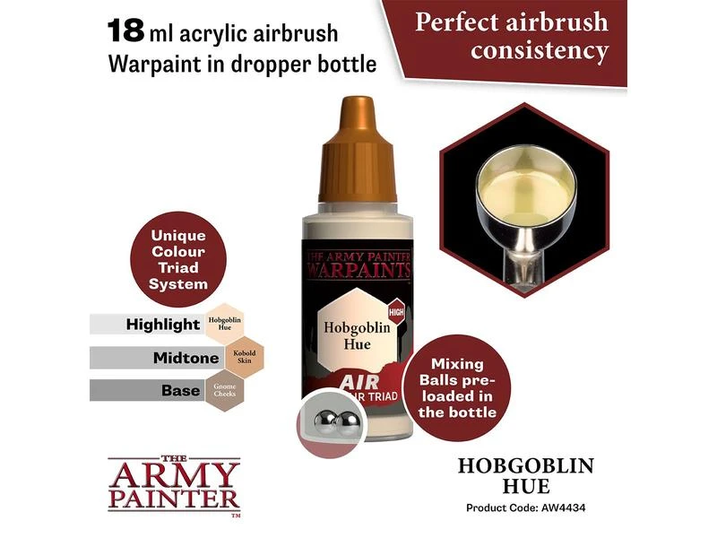 Alle Warpaints Air sind vorgemischt und direkt aus der Flasche airbrushfähig und bestehen aus ultragefilterten, lebendigen Pigmenten. Die Warpaints Air-Reihe wurde in einem einzigartigen und innovativen Triad-System entwickelt – jede passende Warpaints Acrylics-Farbe hat eine entsprechende Base- und Highlight-Farbe. Dies macht das Hervorheben und Schattieren zum Kinderspiel und die Armeebemalung noch schneller und schlüssiger. Um die Sache noch einfacher zu machen, ist Warpaints Air bereits mit zwei Stahlmischkugeln ausgestattet.