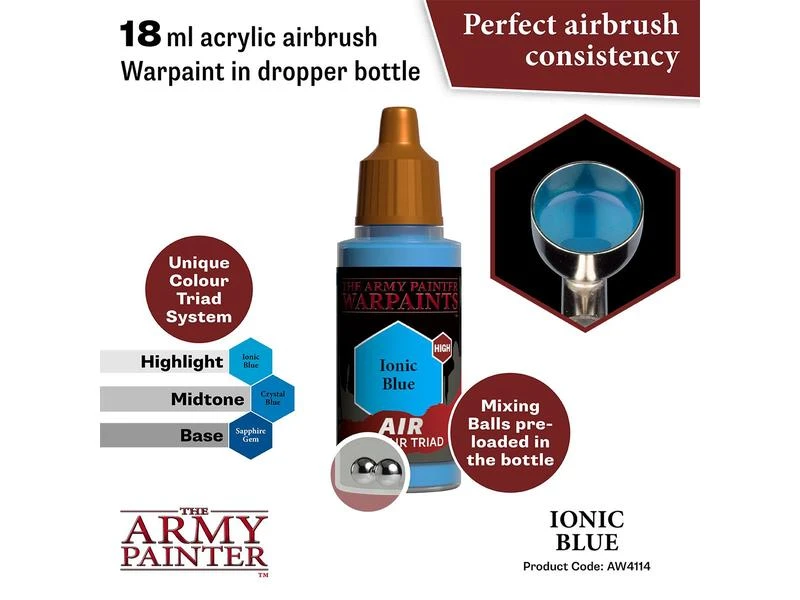 Alle Warpaints Air sind vorgemischt und direkt aus der Flasche airbrushfähig und bestehen aus ultragefilterten, lebendigen Pigmenten. Die Warpaints Air-Reihe wurde in einem einzigartigen und innovativen Triad-System entwickelt – jede passende Warpaints Acrylics-Farbe hat eine entsprechende Base- und Highlight-Farbe. Dies macht das Hervorheben und Schattieren zum Kinderspiel und die Armeebemalung noch schneller und schlüssiger. Um die Sache noch einfacher zu machen, ist Warpaints Air bereits mit zwei Stahlmischkugeln ausgestattet.