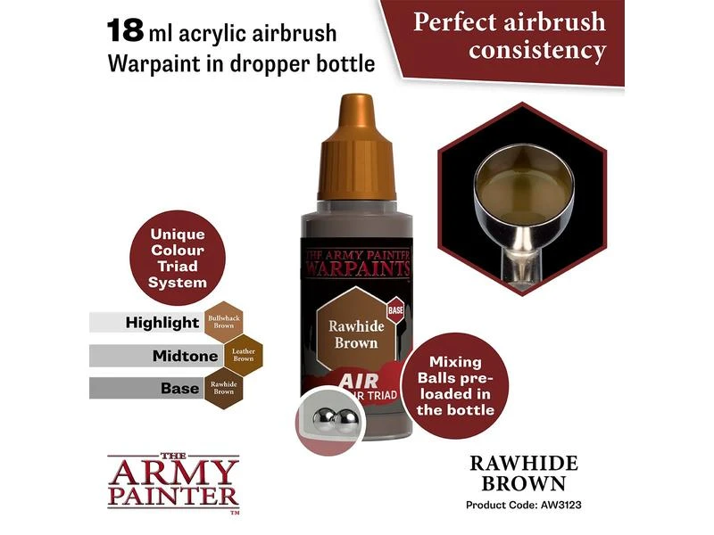 Alle Warpaints Air sind vorgemischt und direkt aus der Flasche airbrushfähig und bestehen aus ultragefilterten, lebendigen Pigmenten. Die Warpaints Air-Reihe wurde in einem einzigartigen und innovativen Triad-System entwickelt – jede passende Warpaints Acrylics-Farbe hat eine entsprechende Base- und Highlight-Farbe. Dies macht das Hervorheben und Schattieren zum Kinderspiel und die Armeebemalung noch schneller und schlüssiger. Um die Sache noch einfacher zu machen, ist Warpaints Air bereits mit zwei Stahlmischkugeln ausgestattet.