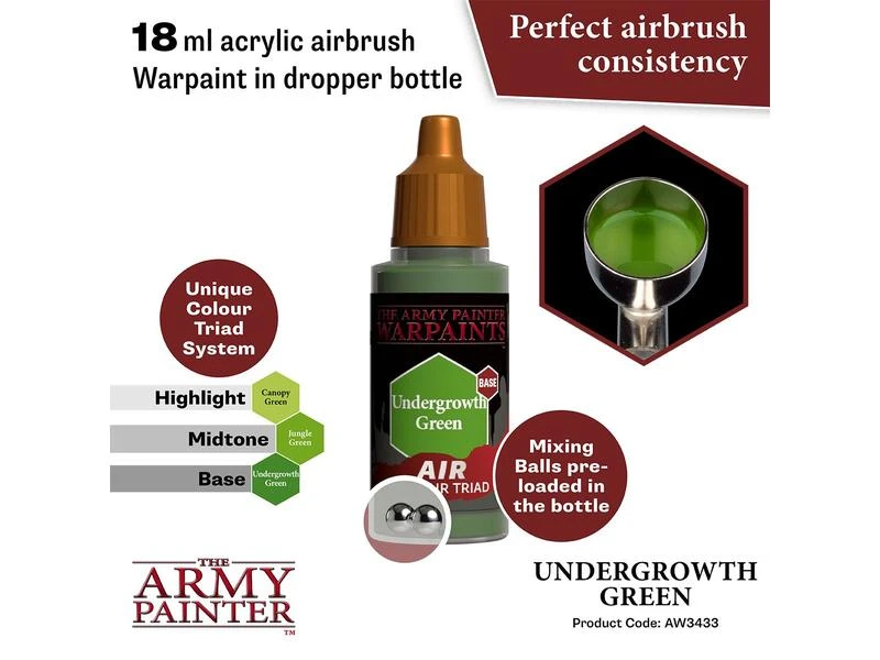Alle Warpaints Air sind vorgemischt und direkt aus der Flasche airbrushfähig und bestehen aus ultragefilterten, lebendigen Pigmenten. Die Warpaints Air-Reihe wurde in einem einzigartigen und innovativen Triad-System entwickelt – jede passende Warpaints Acrylics-Farbe hat eine entsprechende Base- und Highlight-Farbe. Dies macht das Hervorheben und Schattieren zum Kinderspiel und die Armeebemalung noch schneller und schlüssiger. Um die Sache noch einfacher zu machen, ist Warpaints Air bereits mit zwei Stahlmischkugeln ausgestattet.