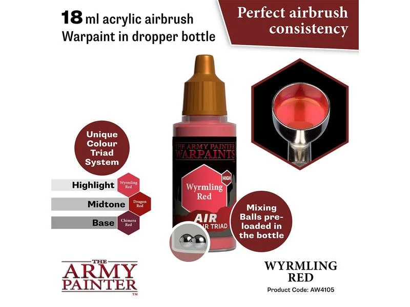 Alle Warpaints Air sind vorgemischt und direkt aus der Flasche airbrushfähig und bestehen aus ultragefilterten, lebendigen Pigmenten. Die Warpaints Air-Reihe wurde in einem einzigartigen und innovativen Triad-System entwickelt – jede passende Warpaints Acrylics-Farbe hat eine entsprechende Base- und Highlight-Farbe. Dies macht das Hervorheben und Schattieren zum Kinderspiel und die Armeebemalung noch schneller und schlüssiger. Um die Sache noch einfacher zu machen, ist Warpaints Air bereits mit zwei Stahlmischkugeln ausgestattet.