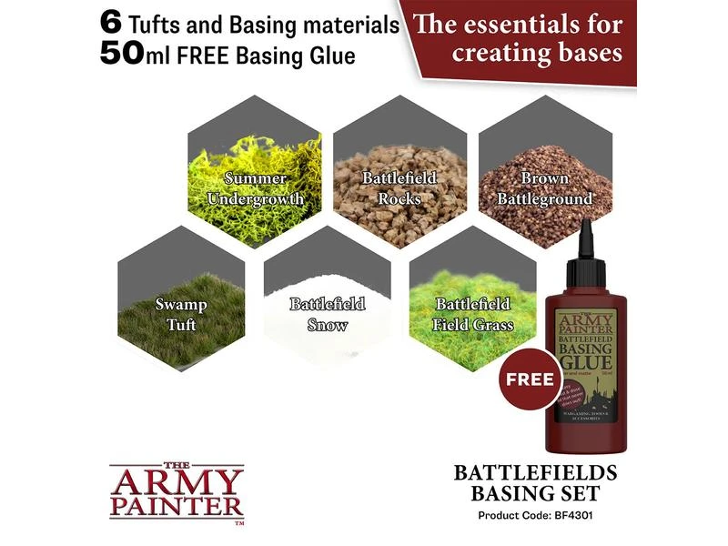 Dieses Set wurde entwickelt, um dem Wargamer eine «one box fits all» für Miniaturbasen zu bieten. Enthält alle grundlegenden Basismaterialien, die Sie benötigen, um jede Basis für Ihre Miniaturen zu machen. Es enthält ausserdem 50 ml «Battlefields Basing Glue» und eine Army Painter Technik Anleitung zum Bemalen.