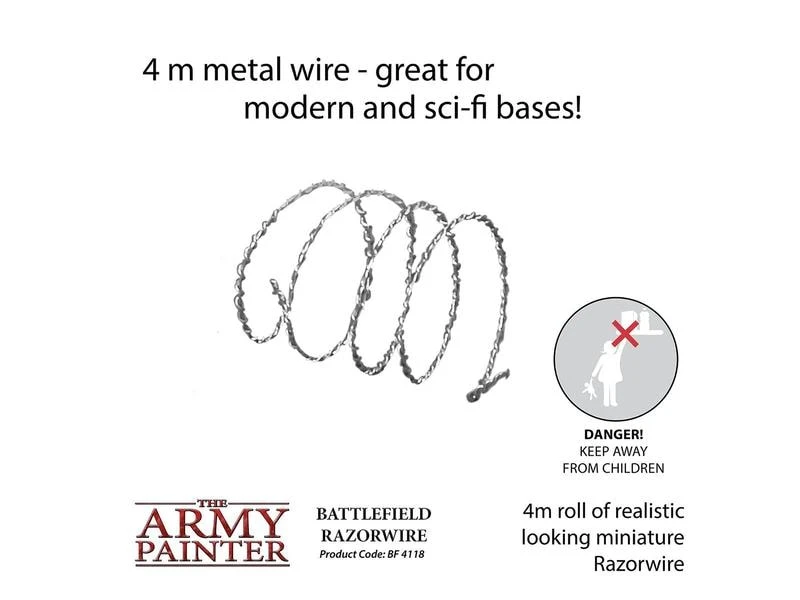 Dieser Stacheldraht vermittelt den Eindruck einer vom Krieg zerrissenen Umgebung – und ist für jede Sci-Fi oder moderne Wargaming-Basis geeignet. Dieser Stahldraht, sorgt für den realistischen Effekt einer vom Krieg zerrissenen Umgebung. Ideal für 15 mm & 28 mm Miniaturen, Militärdioramen, Eisenbahnlandschaften und Geländemodellbausätze.
