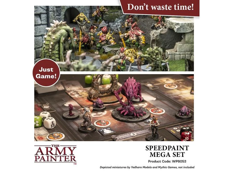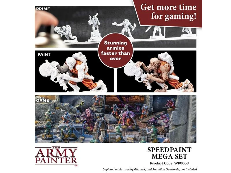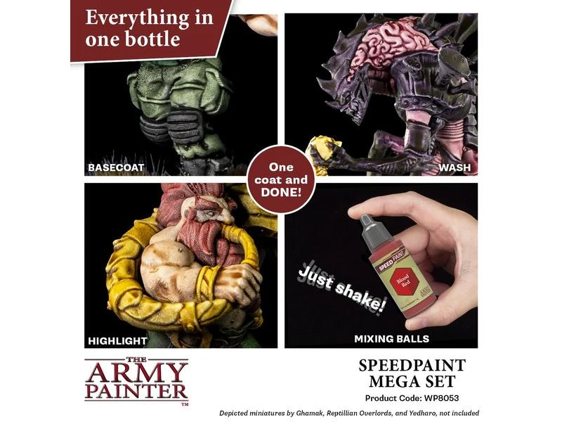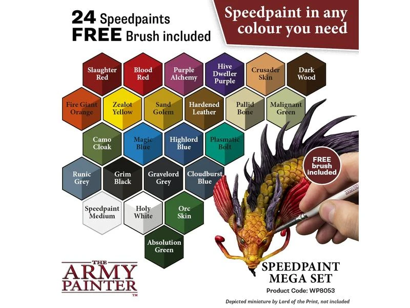 Das All-in-One Warpaint Speedpaint ist eine echte Ein-Schicht-Bemalungslösung. Einfach eine satte Schicht Speedpaint direkt auf eine grundierte Miniatur auftragen und fertig! Speedpaint verleiht dem Modell intensive Schattierungen, leuchtende Farben und einen Lichteffekt in einem Arbeitsgang – so erhalten Sie sofort Farbe und einen perfekten Kontrast für Ihre Miniatur. In Kombination mit einem innovativen Harzmedium, das perfekt über deine Miniaturen fliesst, entsteht eine Bemalungslösung, die hilft, mehr Zeit zum Spielen zu gewinnen. Das Speedpaint-Mega-Set enthält das gesamte Speedpaint-Sortiment mit 24 Farben.