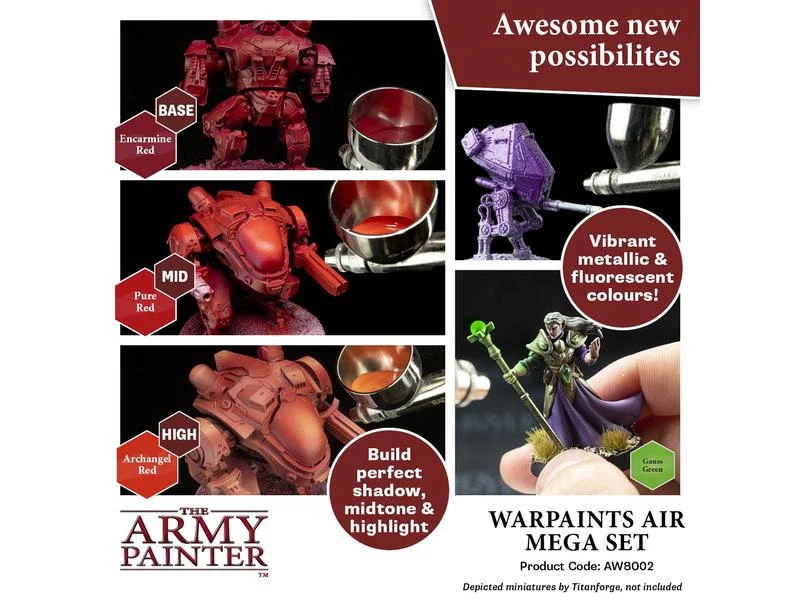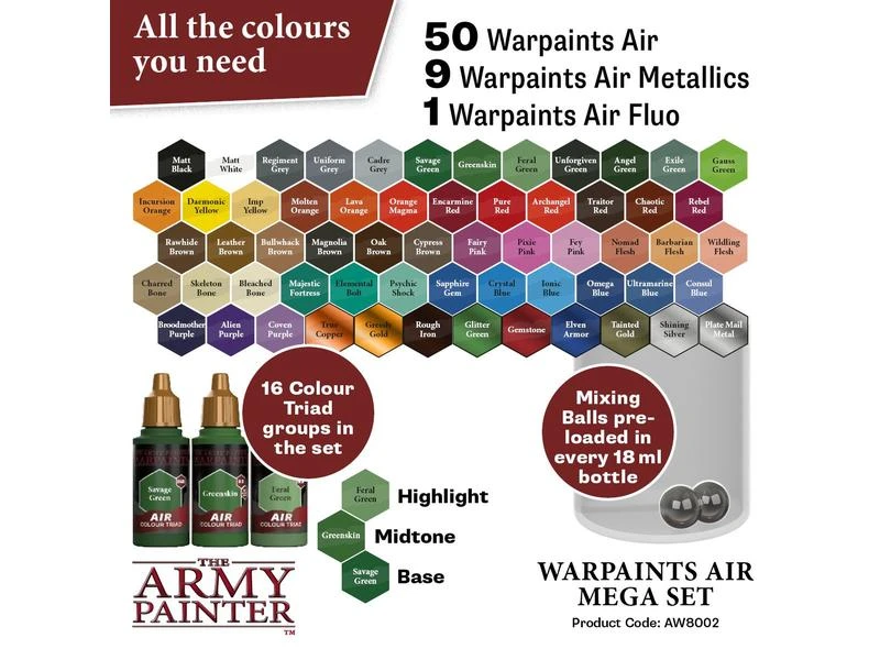 Das Warpaints Air Mega Set ist eine ideale Möglichkeit, eine Sammlung von Airbrush-Farben zu starten, oder eine bestehende zu erweitern. Es enthält eine grosse Auswahl an Farben, von knackigen Grundfarben bis hin zu schimmernden Metallic-Farben – und sogar eine Fluoreszierende Farbe im Lieferumfang. Alle Warpaints Air sind vorgemischt und direkt aus der Flasche airbrushfähig und bestehen aus ultragefilterten, leuchtenden Pigmenten. Das Warpaints Air-Sortiment wurde nach einem innovativen Triad-System entwickelt – jede passende Warpaints Acrylics-Farbe hat eine entsprechende Base- und Highlight-Farbe. Dies macht das Hervorheben und Schattieren zum Kinderspiel und die Armeebemalung noch schneller. Um die Sache noch einfacher zu machen, sind die Warpaints Air-Flaschen bereits mit zwei Stahlmischkugeln ausgestattet.