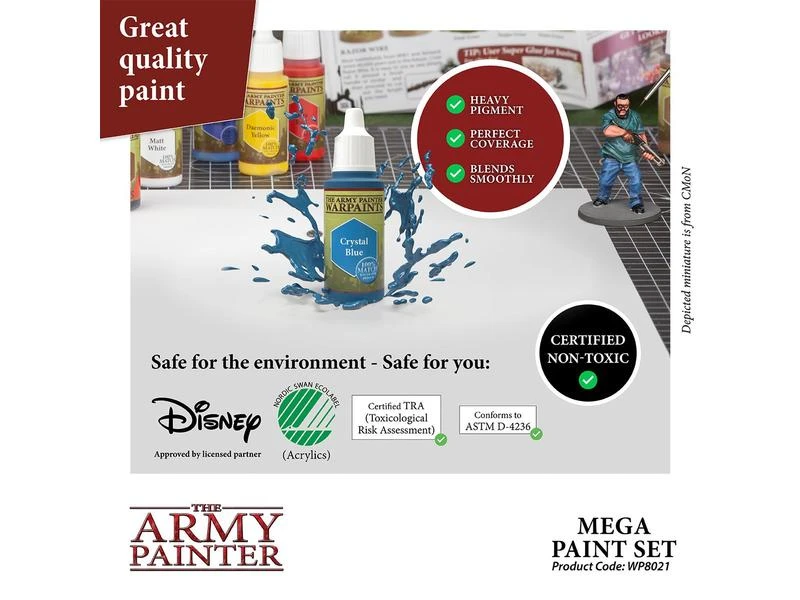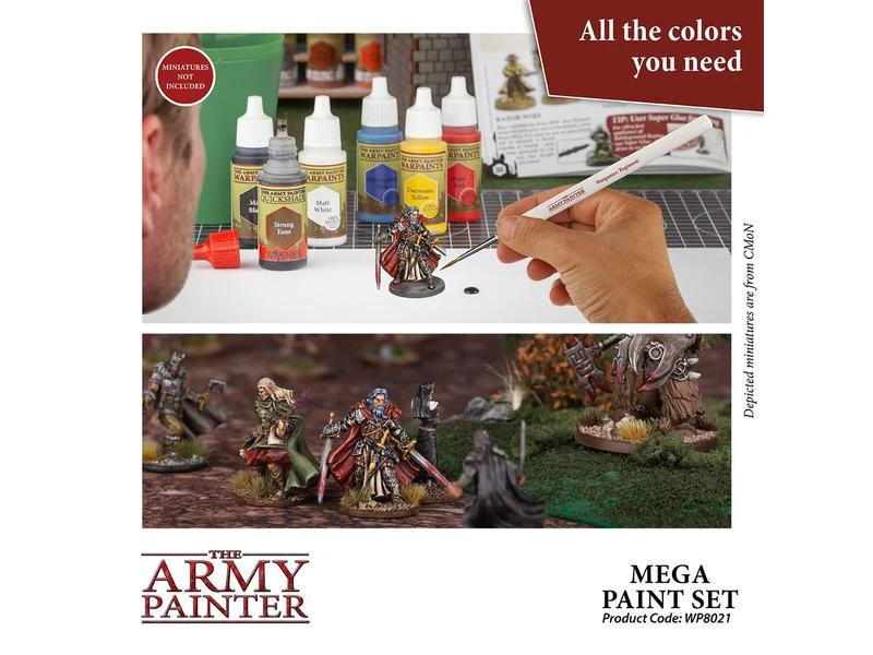 Dieses Mega-Farbset enthält die bestmögliche Qualität an Farben, Metallics und Washes, die heute erhältlich ist. Es enthält alle Farben, die Sie brauchen, sowie einen der beliebtesten handgefertigten Wargaming-Pinsel in der Wargaming-Industrie. Einige Warpaints haben ein Colour Primer Spray Äquivalent – und diese Farben sind mit dem kleinen Logo gekennzeichnet: «100% MATCH». Die Washes sind von hervorragender Qualität und passen auch zu dem gleichnamigen Quickshade Dip – für einen perfekten Schattierungseffekt.