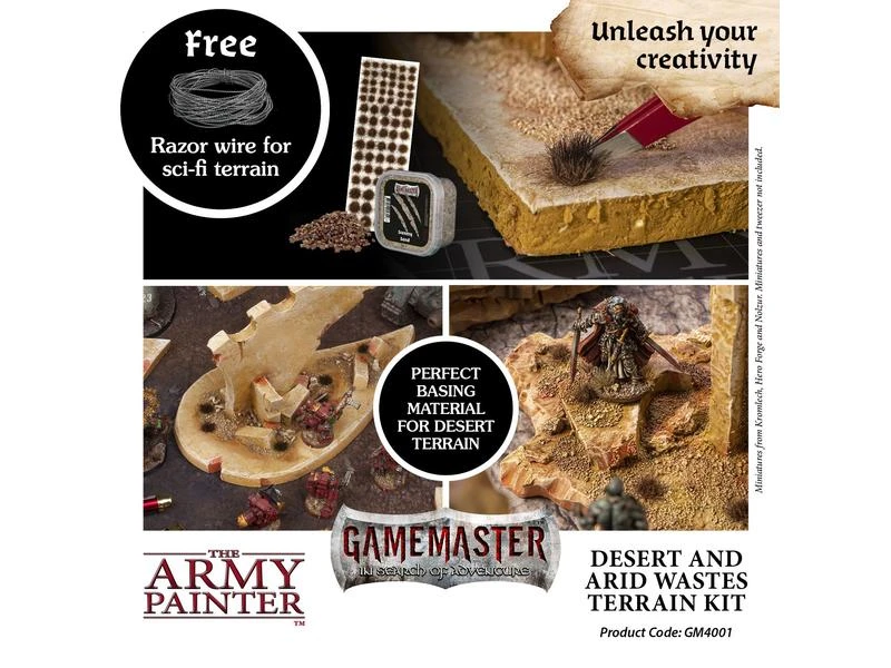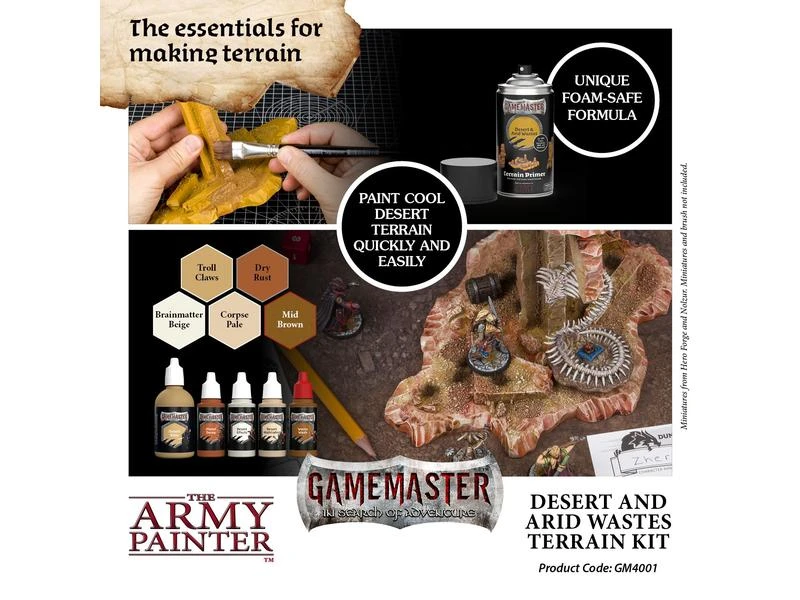 Egal, ob Sie Sanddünen oder verbranntes Land bauen wöchten, das GameMaster: Deserts & Arid Wastes Terrain Kit versorgt Sie mit allen Farben und Basismaterialien, die Sie brauchen, um erstaunliche Landschaften für jedes RPG-System oder Skirmish-Miniaturenspiel zu bauen. In diesem Bausatz findest Sie einen einzigartigen Terrain Primer, der Ihr Baumaterial nicht angreift – egal ob Sie mit XPS-Schaum, Styropor oder MDF-Faserplatten baust. Kombiniert mit handverlesenen Farben, Washes, Basismaterialien und Tufts sind Sie auf dem besten Weg, staubige Verstecke und dürre Gelände zum Leben zu erwecken. Lassen Sie sich von nichts anderem als Ihrer Vorstellungskraft zurückhalten! Lassen Sie sich von den zahlreichen Online-Anleitungsvideos oder der diesem Set beiliegenden Inspirationsanleitung inspirieren.