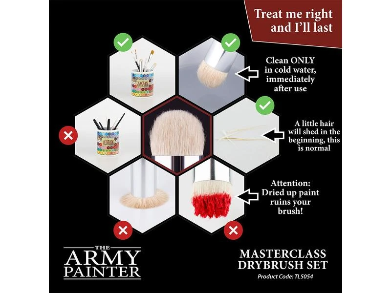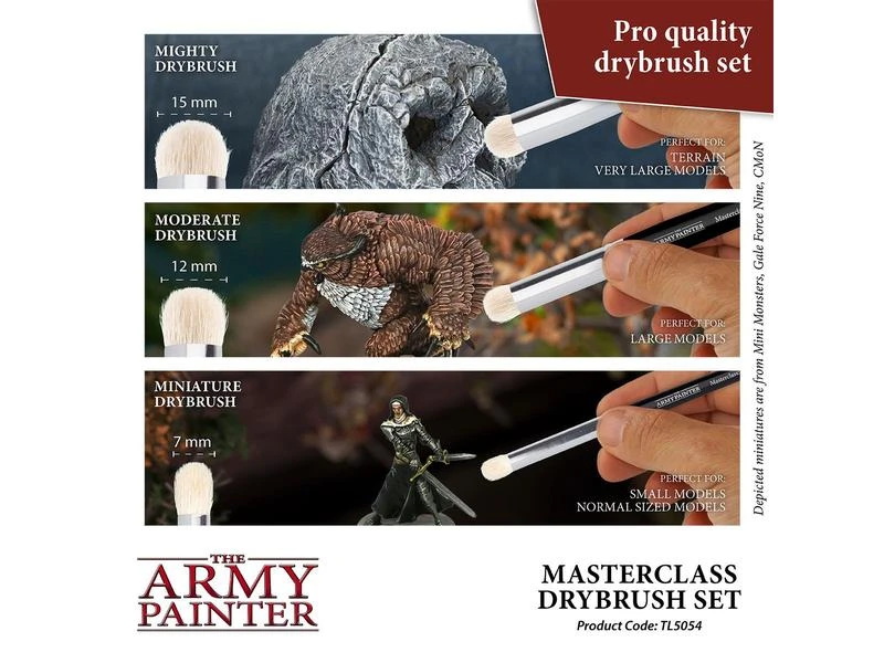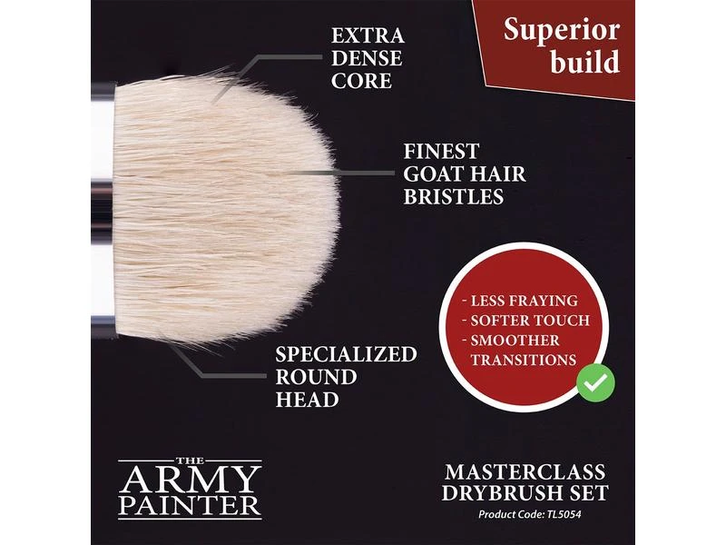 Diese praktischen und spezialisierten Drybrushes liefern tolle Ergebnisse und eine sehr gleichmässige Deckkraft, die jedes Detail Ihrer Miniatur zum Vorschein bringt. Die Pinsel sind vielseitig einsetzbar und können sowohl für grosse Modelle, Gelände und Fahrzeuge als auch für jedes normal grosse Modell verwendet werden. Die Ergebnisse und Effekte, die Sie mit diesen Masterclass Drybrushes erzielen, übertreffen die eines normalen Drybrushes. Hochwertige, kuppelförmige Spitze – Die weichen Ziegenhaarborsten in Kombination mit der abgerundeten Kuppelform ermöglichen eine sehr sanfte Berührung selbst bei grobem Drybrushing und sorgen für ein subtiles und raffiniertes Ergebnis.