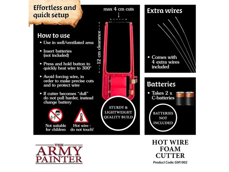 Dieser präzise Heissdraht-Schaumstoffschneider ermöglicht saubere, genaue und schnelle Schnitte – jedes Mal! Er ist das ideale Werkzeug zum Schneiden von XPS-Schaumstoffplatten für jede Dungeon-Kulisse, jedes Wargaming-Gelände oder jede Landschaftskulisse. Inklusive 4 extra Drähte.