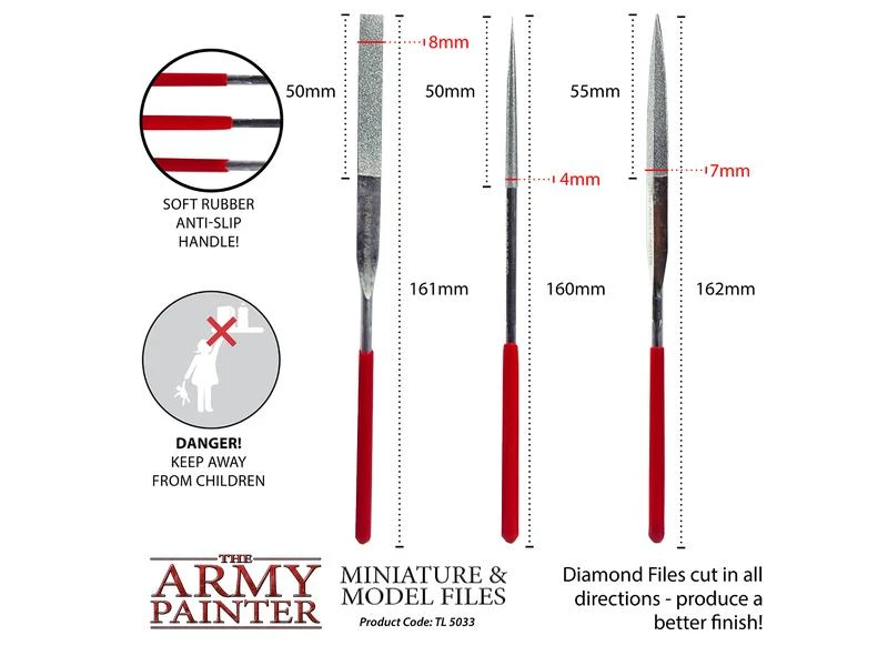 Diese 3 Diamantfeilen sind extrem vielseitige Werkzeuge für den Wargamer und Bastler. Ein Muss für individuelle Umbauten und das Säubern von Formlinien sowie die Vorbereitung von Teilen zum Kleben. Funktioniert auf Kunststoff-, Harz- und Metalloberflächen.
