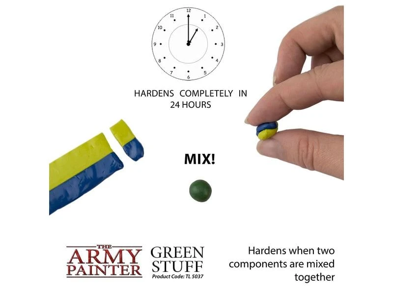Das ursprüngliche Kneadatite (am besten bekannt als Green Stuff) wird von Modellbauern und Bastlern für Umbauten, zum Füllen von Formlinien und zum Modellieren von Miniaturen verwendet. Es härtet schnell aus, mit einer Arbeitszeit von 20-30 Minuten für die Formgebung und nur 8 Stunden für die vollständige Trocknung. Mischen Sie gleiche Teile der gelben und blauen Spachtelmasse, bis Sie eine gleichmässige grüne Farbe erhalten.